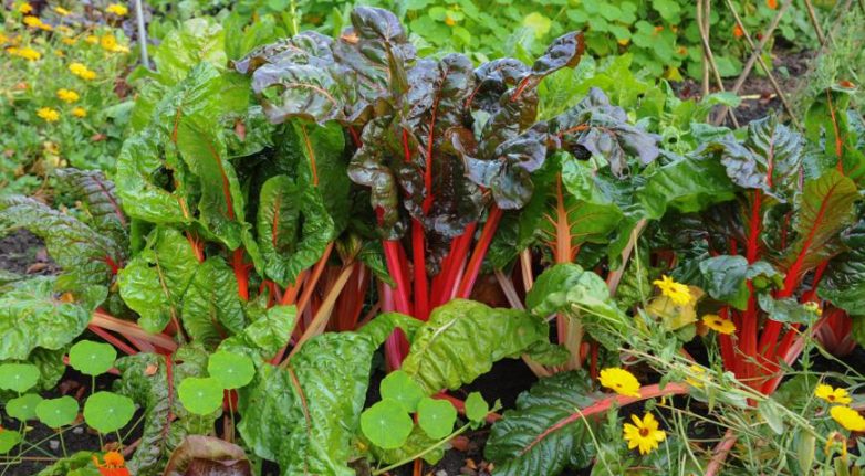 Для одиночной посадки и создания заднего плана подойдут высокорослые растения: подсолнух, кукуруза, укроп, амарант, топинамбур, любисток, ревень, высокие томаты. Под ревенями найдут свое место щавель и хрен, дополнят и украсят его цветами и зонтиками мята, душица, многолетние луки, бораго и пряные травы.