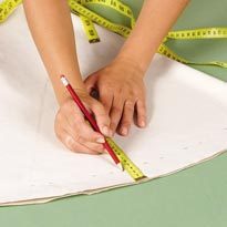 Разрежьте ткань на 2 квадрата 1,5 х 1,5 м. Каждый квадрат сложите в четыре раза и с помощью сантиметра и карандаша очертите четверть круга радиусом 65 см. Выкройте 2 круга. Отступив от края 4 см, прочертите линию.