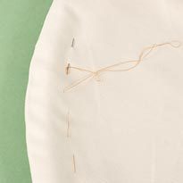Разрежьте синтепон, оборачивающий обруч в прорезях чехла, сместите его по обручу внутрь чехла и зафиксируйте ниткой. Прорези по периметру сшейте потайным швом. Закончив их обрабатывать, зафиксируйте чехол на обруче: по наметке, на расстоянии 7 см от края, простегайте его как ватный матрас. Прошивайте чехол насквозь несколькими стежками, используя прочную нить, затем закрепляйте ее. Повторяйте стежку через равные промежутки с интервалом 7–8 см – тогда плотная джинсовая ткань будет свободно собираться мягкими складками.