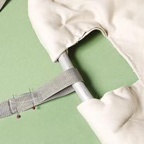 Разрежьте ременную ленту или стропу на отрезки длиной 2 м. Оплавьте ее концы над огнем. Обернув обруч концом ленты, сколите ее булавками и прострочите (см. схему). Чтобы зафиксировать ленту, можно поставить в металлоремонте несколько заклепок.