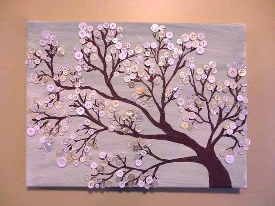 Создать такое пуговичное дерево сможет даже начинающая мастерица из куска картона и остатков самых обыкновенных пуговиц от ненужной одежды. Особенно эффектно смотрятся композиции в виде веток деревьев, обрамленные листвой, выполненной из белых и прозрачных пуговиц.