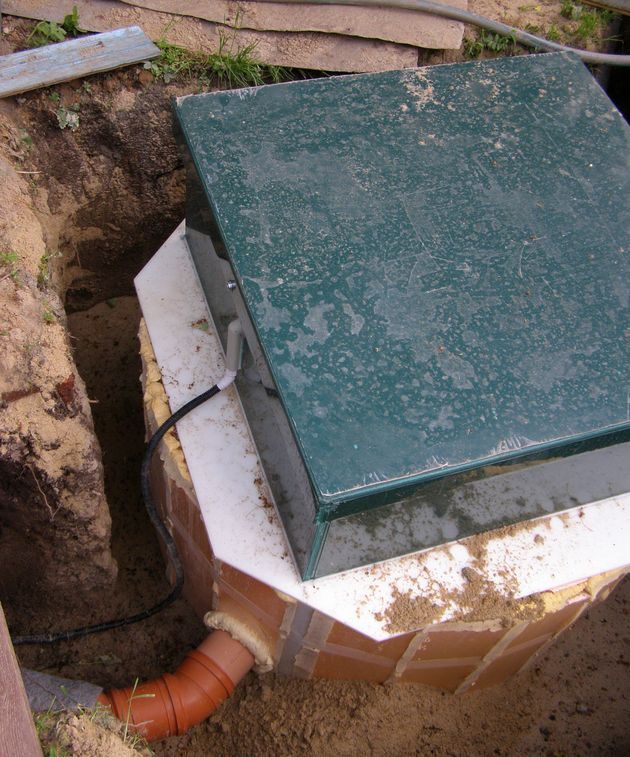 Сначала подготовили яму глубиной 230 см и сторонами 150х150см. На дно уложили слой речного песка толщиной 10 см и уплотнили его водой. Затем на дно ямы установили септик, сориентировав его по направлениям входа и выхода. Полная масса септика выбранной модели составила примерно 100 кг. Втроем при помощи веревок передвинуть и спустить в яму такой груз – задача вполне реальная. После установки на место нижнюю часть септика обсыпали смесью песка с цементом на высоту около 1 м, чтобы исключить любые его подвижки в дальнейшем. Засыпали до верхней площадки септика песком, уплотняя его водой, а самую верхнюю часть ямы, до низа крышки, – обычной землей и утрамбовали ее. К этому моменту агрегатный отсек должен быть подключен к электрической линии.