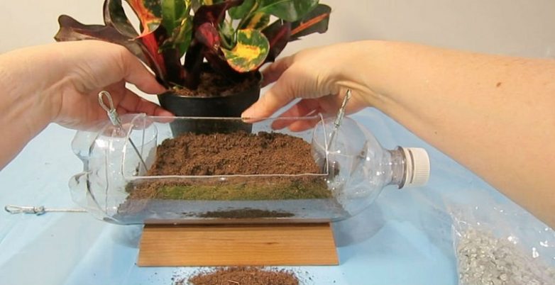 Сделай 8 проколов по низу бутылки и усыпь дно гравием для дренажного эффекта. Если ты собираешься подвесить бутылки или поставить на подоконник, позаботься о поддоне.