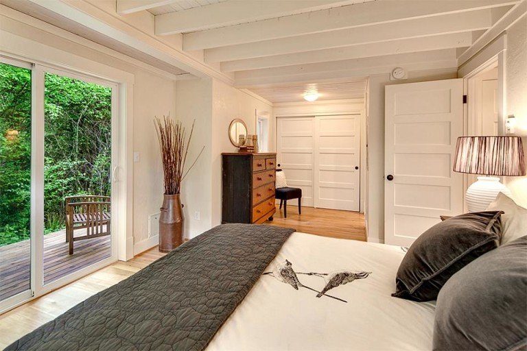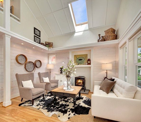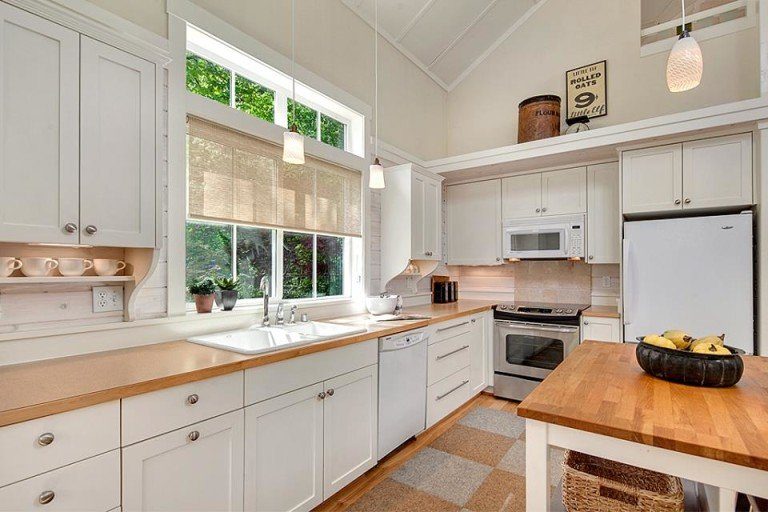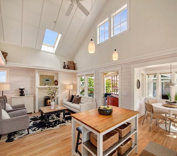 Домик может похвастаться высокими потолками и большим количеством окон. При этом стены и потолок выкрашены в белый, а проникновению в интерьер естественного света ничего не мешает. Благодаря таким несложным приемам пространство кажется гораздо светлее и просторнее.