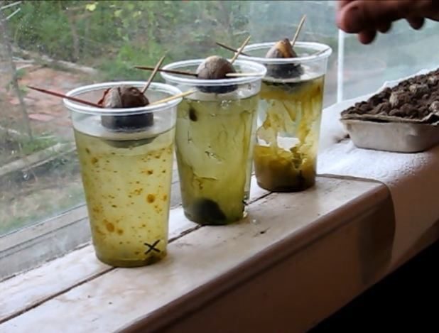 Чтобы вырастить новый авокадо, при помощи зубочисток повесьте его косточку над стаканом с водой так, чтобы ее донце касалось воды. Когда появятся корни, добавьте в воду землю.
