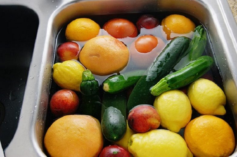 Наполни чистый таз или раковину водой, налей туда 60 мл перекиси водорода и оставь в этом растворе фрукты или овощи на 30 минут. Затем ополосни чистой водой.