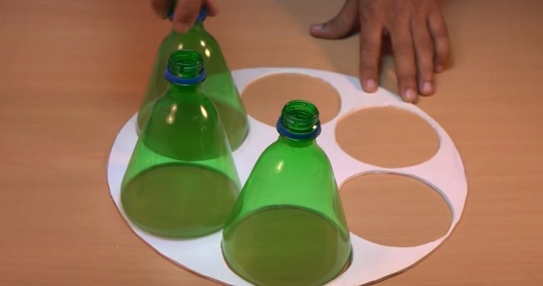 В каждый кружок вставь отрезанную часть бутылки и зафиксируй их изнутри скотчем, чтобы они не сдвинулись при приклеивании.