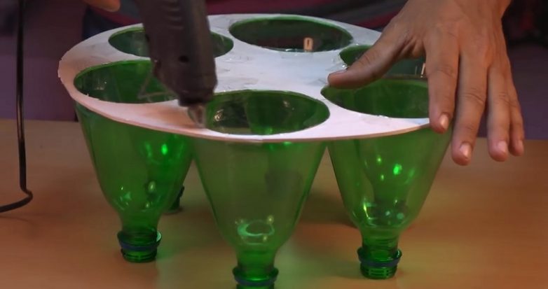 Закрепи бутылки термоклеем. Можно использовать клеевой пистолет, а можно — палочку клея, разогретую над свечой или зажигалкой. Не совсем безопасно, зато клеевой пистолет покупать не придется.