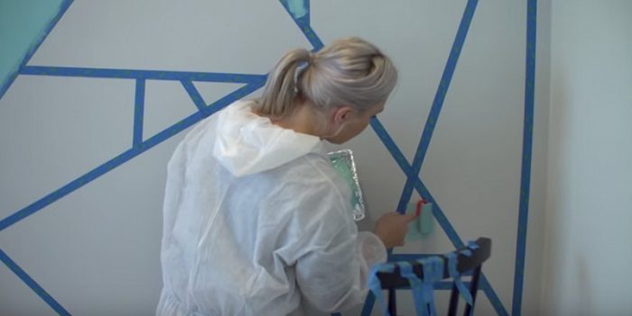 Перед началом работы стену нужно хорошенько очистить от пыли и грязи. Если основной цвет стены тебя не устраивает, следует нанести на нее один основной тон, который станет базой рисунка.Теперь в ход идет скотч! Наклеивай его, создавая волшебные геометрические узоры.
