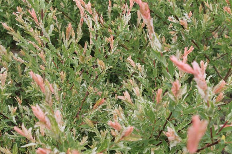 Цельнолистая ива хакуро нишики — симпатичный изящный кустарник, белые листочки которого окрашиваются на солнце во все оттенки розового.