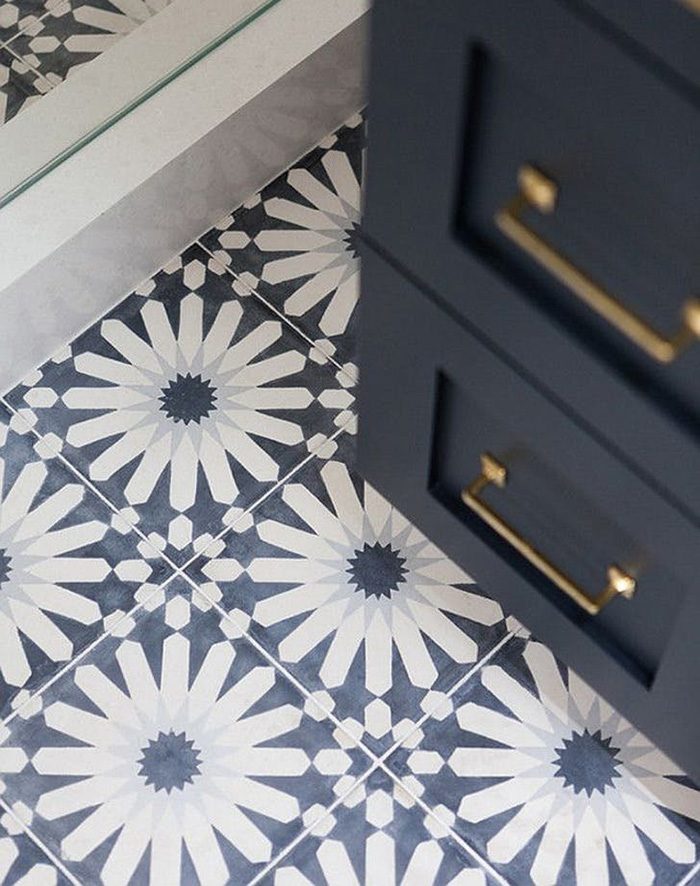 В данном варианте дизайнер использовал сине-белую плитку в стиле испанского узора азулехос в сочетании с латунными светильниками и краником. Удивительное великолепие!