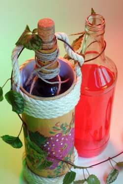 Плотно прижмите веревку и подержите так некоторое время, дайте клею хорошенько просохнуть. Оригинальная авторская упаковка для бутылки, в которой можно приподнести подарок, готова.