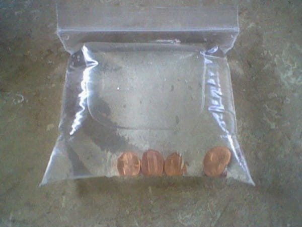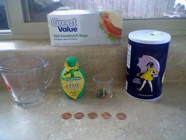 Для реализации задуманного вам потребубтся несколько простых материалов: полиэтиленовый пакет, обычная поваренная соль, сок лайма или лимона, скрепки для бумаг и несколько монет.Сначала вылейте в миску два стакана воды, после чего насыпьте туда две чайных ложки соли и хорошенько всё перемешайте.