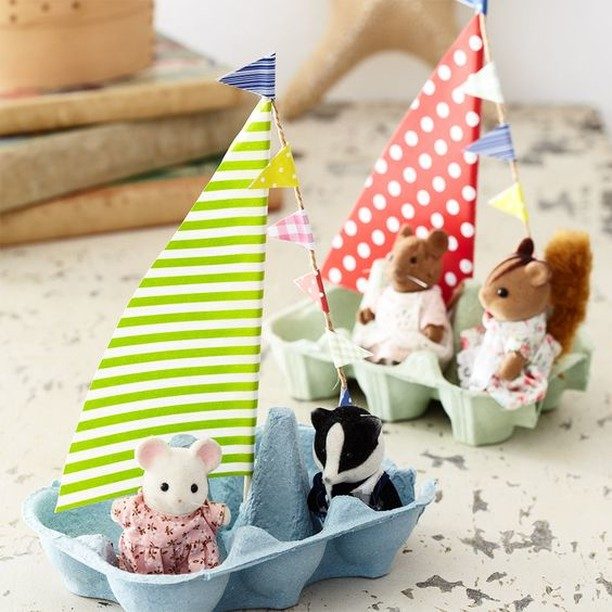 У детей всегда найдется коллекция мини-игрушек – маленькие пупсы, солдатики, зверушки или человечки из наборов Lego. Давайте отправим их в «плаванье», рассадив на кораблики из яичных коробочек. С парусами, конечно!