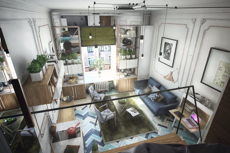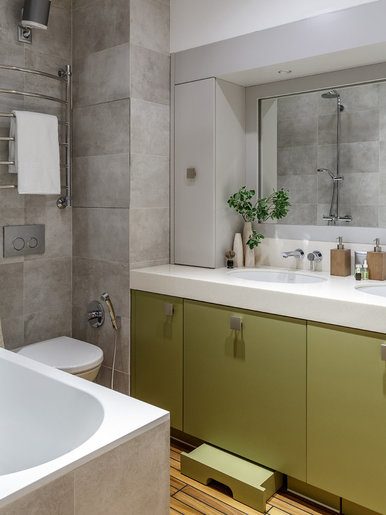 «Благодаря таким простым решениям, маленький санузел, в котором высота потолка чуть больше двух метров, не кажется небольшим», – комментирует автор проекта. Кстати, под потолком разместили антресоль – идеальное место для хранения елки и чемоданов. Внешне ее дверь совершенно не заметна – она выполнена в виде скрытого люка, облицованного той же керамогранитной плиткой, что и стена. В маленькой студии площадью 24 квадратных метра дизайнеры ToTaste Studio для отделки пола выбрали яркую плитку, имитирующую паркетную доску – практичный и оригинальный по своему дизайну материал. «По сути, вся квартира – большое, чистое, светлое помещение, куда мы добавили два основных цвета – зеленый и синий, – комментирует дизайнер Макс Жуков. – Оттенки холодной синей «елочки» на полу по всей квартире объединяют пространство, не дробя его на мелкие элементы».
