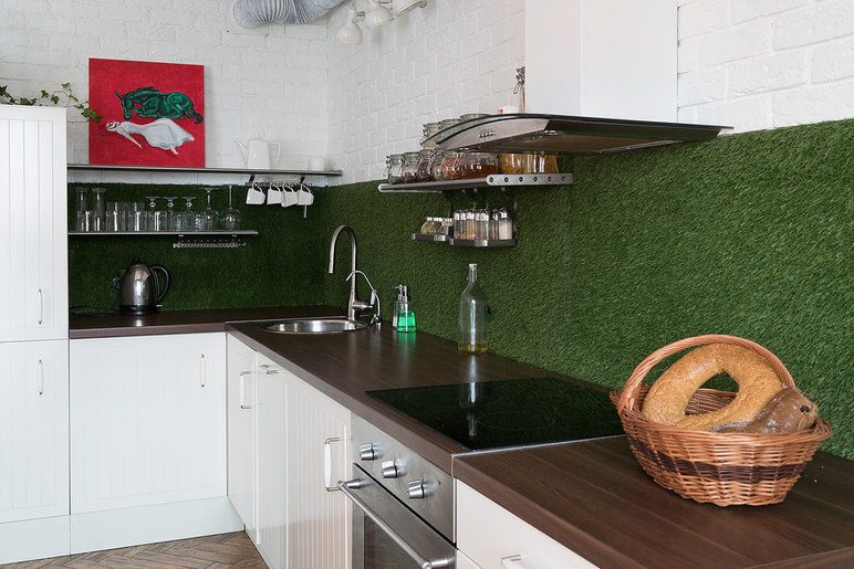 Эту кухню дизайнер Марина Сирко выделила с помощью напольной плитки под дерево и яркого газона на фартуке – помещение сразу стало напоминать ни много ни мало летнюю веранду. Последний дизайнер нашла случайно в строительном магазине – искусственный голландский газон крепится к стене на липучках и за ним очень легко ухаживать.
