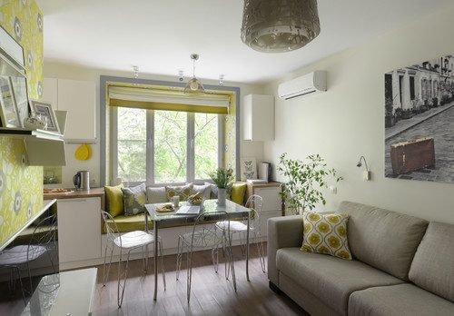 Крошечная квартира студия с встроенным диванчиком у окна. Сиденье по сути является продолжением кухонного гарнитура (его уровень понизили, сделали вместительные ящики); батарея осталась на прежнем месте — ее спрятали за спинкой. Для конвекции воздуха сверху в подоконнике встроена решетка, а снизу оставлены отверстия в цоколе, — поясняет автор проекта Владислава Гравчикова.Несмотря на внешнюю компактность столовой, мягкий диванчик, раскладной стол и легкие стулья позволяют рассадить не менее 6 человек