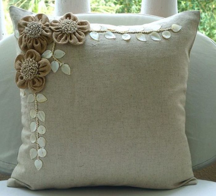 Такая декоративная подушка будет отлично смотреться на диване. Можешь сделать как наволочки из мешковины, так и саму подушку, наполнив ее перьями или синтетическими материалами.
