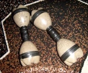 Гантели на цементной основе выходят гораздо более тяжелыми, чем бутылочные. Большие и тяжелые, солидные блины для гантелей и штанг получаются из раствора, затвердевшего в определенной форме с грифом внутри. Главный недостаток такого инвентаря — невозможность оптимизировать под постоянное наращивание нагрузок или под другого человека.То есть, если вам понадобится гантель с другим весом — придется делать новую. Также недостатком цемента часто называют его хрупкость и рассыпчатость. Для укрепления смеси в раствор добавляют клей (ПВА), и если вы не любите, подобно пауэрлифтеру, с победным криком бросать штангу на пол, то вряд ли она быстро придет в негодность.