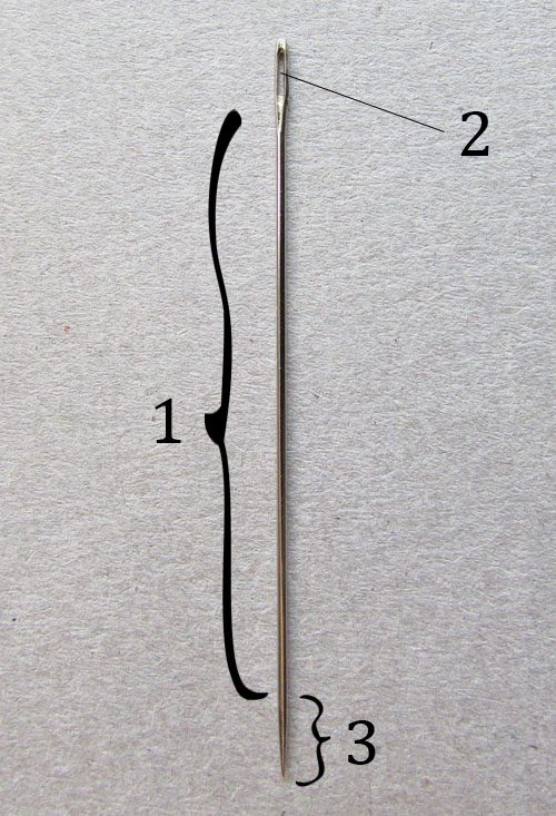 Берем иглу в левую руку (для правшей) и располагаем ушко иглы на подушечке указательного пальца так, чтобы вход в ушко располагался параллельно поверхности подушечки пальца.