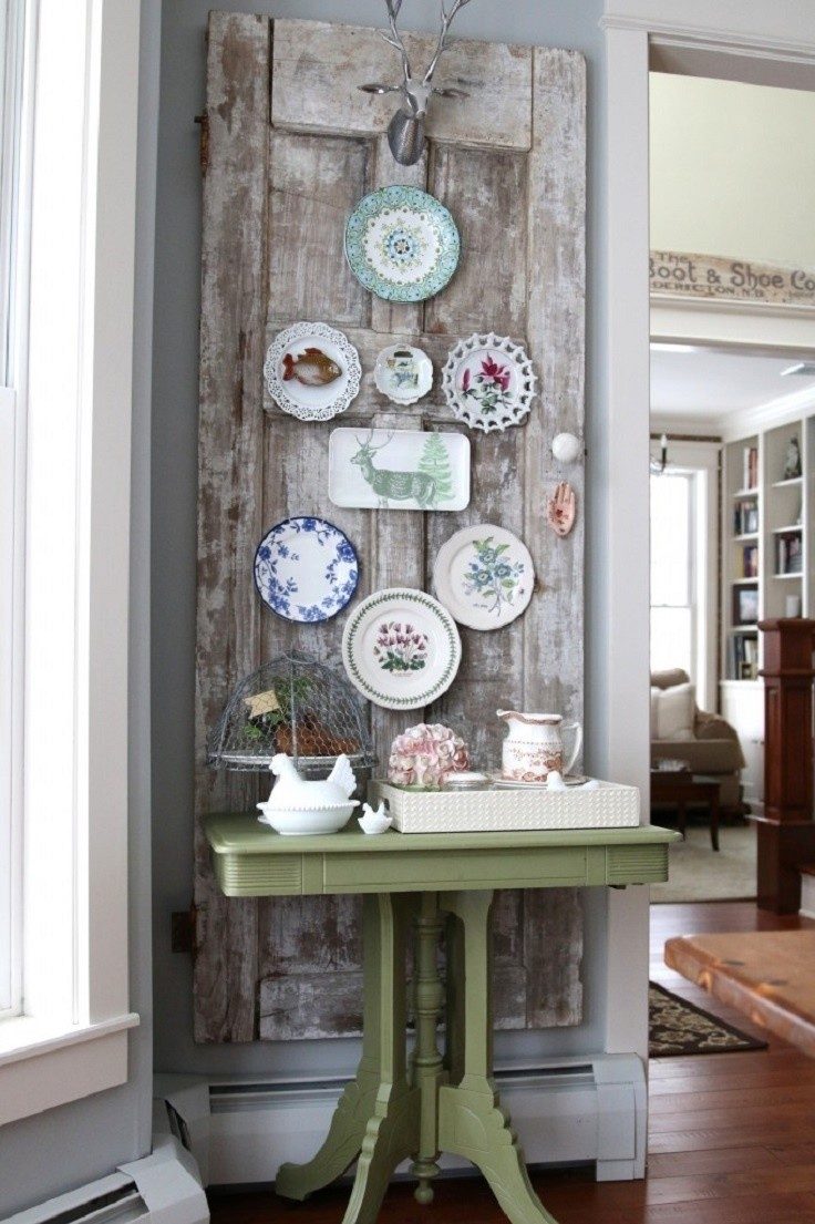 Если очень хочется повесить на видное место тарелочки из путешествий, но жалко стену, сделайте из двери доску для украшений