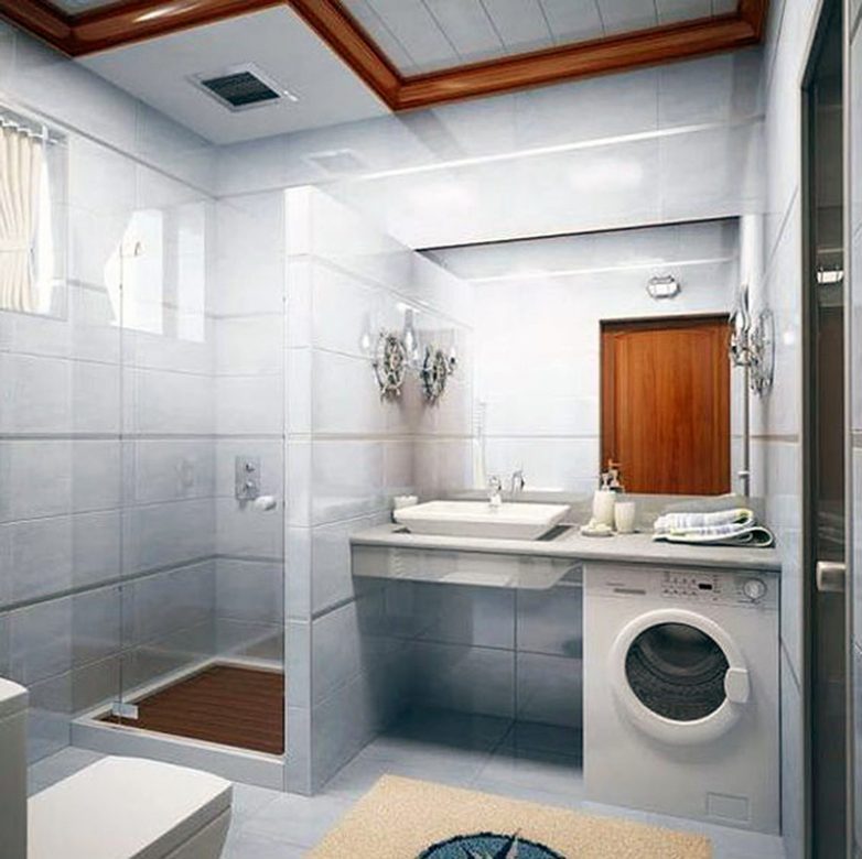 Самый популярный прием при дизайне ванной комнаты — это размещение стиральной машинки возле умывальника. Для гармонии их лучше объединить одной столешницей.Для того, чтобы визуально расширить пространство, над столешницей будет правильно повесить зеркало.
