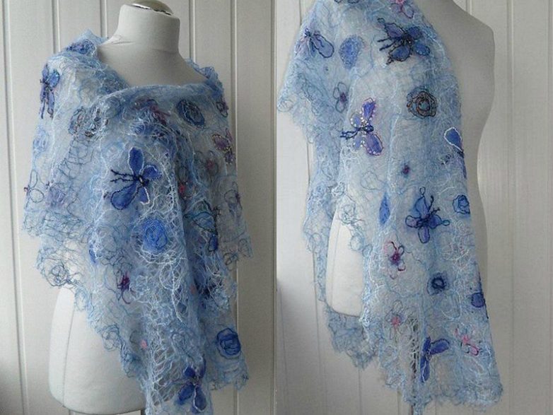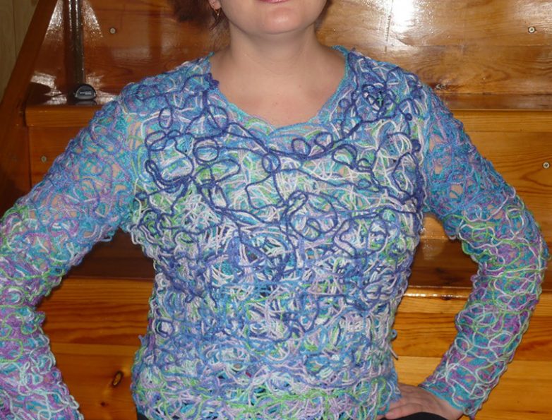 В таком случае основой для будущего материала станет не стабилизирующая пленка, а ткань или сетка. Они не растворяются в воде, и становятся нижним слоем или фоном. И в этом случае вещи получаются не ажурные, а довольно плотные.