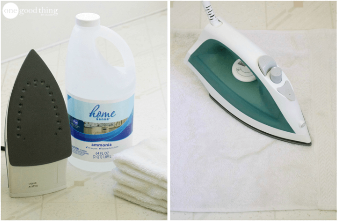 Положите влажную тряпочку (или маленькое полотенце) на место, которое вы собираетесь отмывать, а затем ставьте на тряпку разогретый утюг. Будет много пара, так что не обожгитесь.