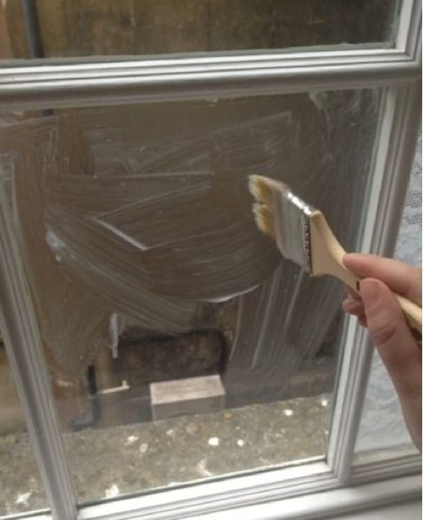 С помощью кисточки нанесите толстый слой крахмального желе на оконные стекла. Для его приготовления смешайте кукурузный крахмал с холодной водой, далее залей эту смесь кипящей водой.