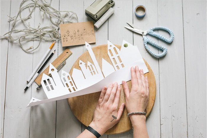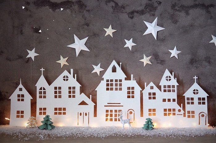 Для создания этого декора тебе потребуется: плотная бумага, карандаш, ножницы, линейка, ластик, макетный нож, клей-карандаш, новогодняя гирлянда (лучше на аккумуляторах) и полка для картины (обязательно с бортиком, который будет удерживать картину).