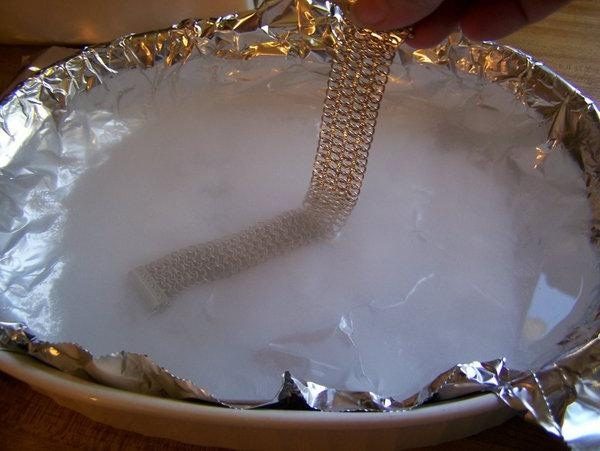 Нагрейте воду в микроволновке; Возьмите небольшую глубокую миску и выстелите на донышко лист алюминиевой фольги.Вылейте туда горячую воду, которую вы подготовили.Добавьте остальные ингредиенты (соль, соду, средство для мытья посуды) и перемешайте компоненты.Сложите украшения в миску и дайте постоять 5-10 минут.По завершению процедуры драгоценности прополощите под тёплой водой и насухо вытрите полотенцем.Ура! Теперь ваши украшения будут вновь восхищать вас своим блеском и бесподобной красотой! К тому же, они будут выглядеть так, как будто вы только что приобрели их в ювелирном салоне!