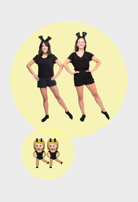 Костюмы эмоджи — отличная идея и очень популярный сейчас тренд. Так что, если собираетесь идти на вечеринку с подругой, надевайте черные шорты, футболку и заячьи ушки. Беспроигрышный вариант.