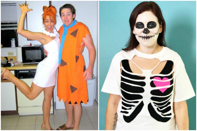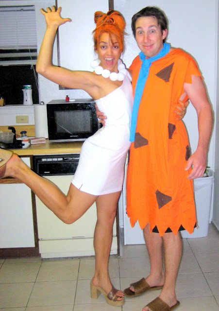 Если захотите стать Вилмой и Фредом, парочкой из популярного мультика, просто наденьте белое платье, крупные бусы и прикупите рыжий парик. Ну а спутнику можно быстро выкроить простую тунику из куска оранжевой ткани.
