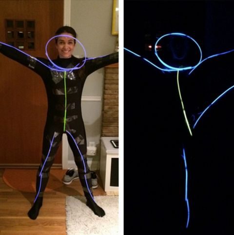 Такой костюм будет здорово смотреться в темноте. Все, что нужно — это эластичное черное трико и несколько светящихся неоновых палочек, которые можно прикрепить друг к другу с помощью скотча.