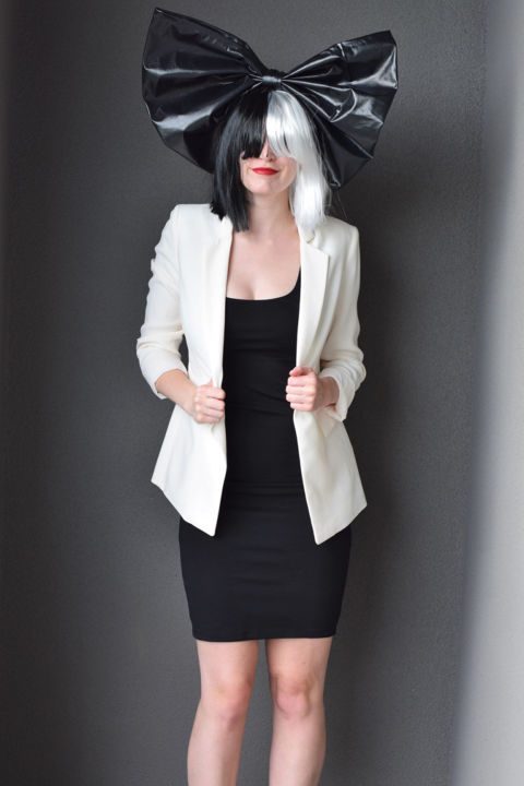 Для костюма нужно купить двухцветный парик, а дальше все очень просто: маленькое черное платье, белый жакет и огромный бант (по желанию).
