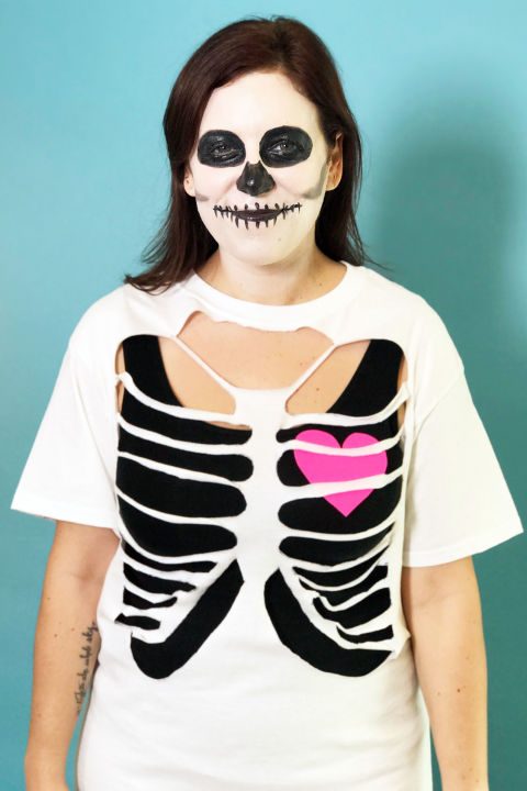 Берите ненужную белую футболку и безжалостно разрезайте ее ножницами, чтобы получилась грудная клетка. Подденьте вниз черную майку с наклеенным сердцем и не забудьте про макияж, без него вам никого не удасться испугать.