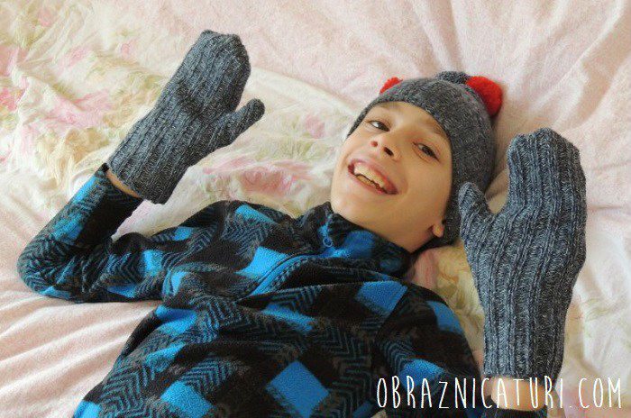 Точно так же из обычных рукавов свитера. Когда будете примерять руку, помните, что рукавица должна закрывать запястье.