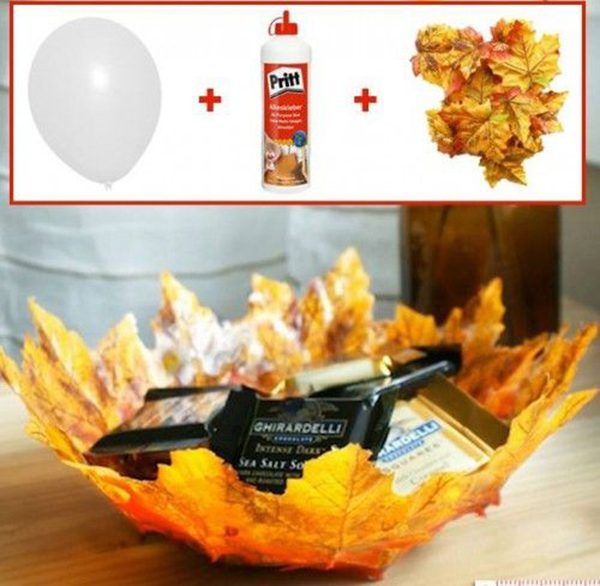 Очень интересная идея создания конфетницы или просто стильной вазочки из кленовых листьев. Для создания тебе понадобиться воздушный шар, силиконовый клей и, конечно же, кленовые листья.