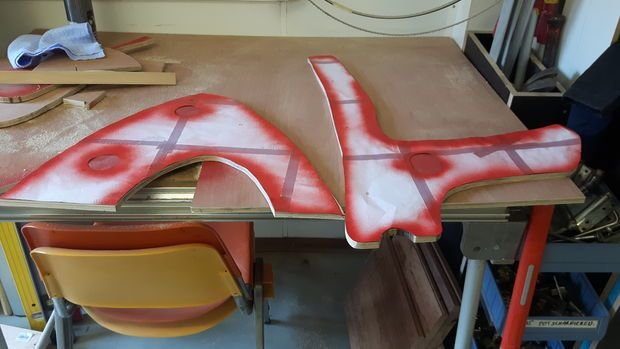 После разметки листов фанеры парень использовал лобзик для грубого вырезания деталей.