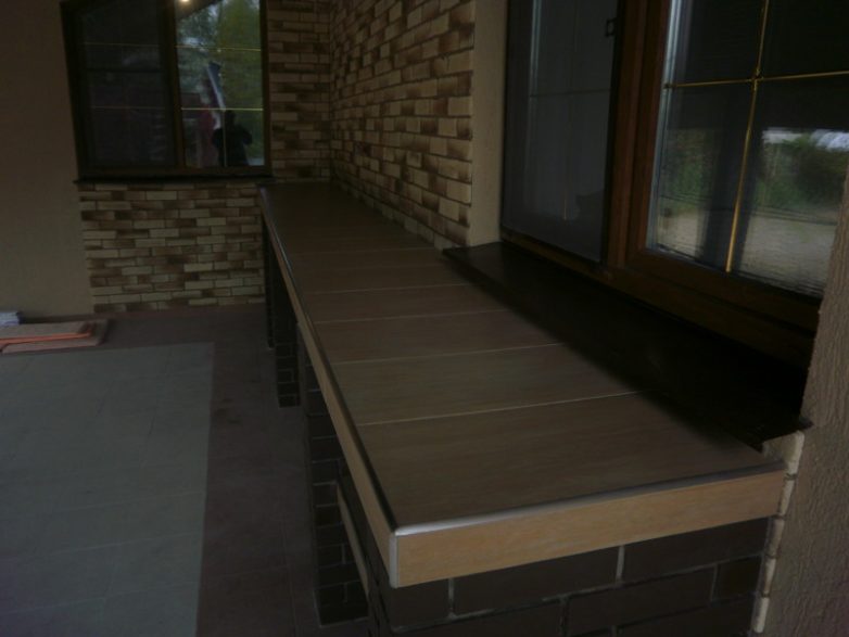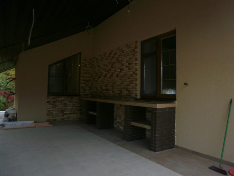 ЦСП промазали бетонконтактом и уложили плитку. Вот что получилось.Функционал. Левая ниша — для небольшого холодильника в летний период (розетка заранее выведена из дома). Полки — что-нибудь класть (посуду, бутылки и т.д.). Центральная ниша — посидеть за кружкой пива (пару барных стульев уже подбираю). На самой столешнице летом будет стоять телевизор (розетка выведена из дома), музыкальный центр. Так же на неё будет ставиться всё, что подаётся из окна. Ну и посуда с главного стола (ещё не купил) будет убираться на столешницу. Всё. Можете выдавать критические замечания, пинки и пожелания.