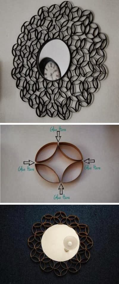 Разрезаем рулон на тонкие колечки, сгибаем их до формы сплюснутого эллипса, скрепляем между собой клеем или скобками степлера. Теперь остается только скомпоновать ажурную конструкцию и подыскать место для её монтажа. Например, вокруг зеркала.