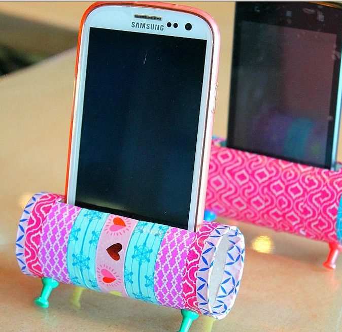 Делаем прорезь под сам гаджет, далее втыкаем снизу четыре или больше канцелярских иголок — они будут ножками подставки. Раскрашиваем или обклеиваем изделие цветной бумагой на свой вкус. Готово.