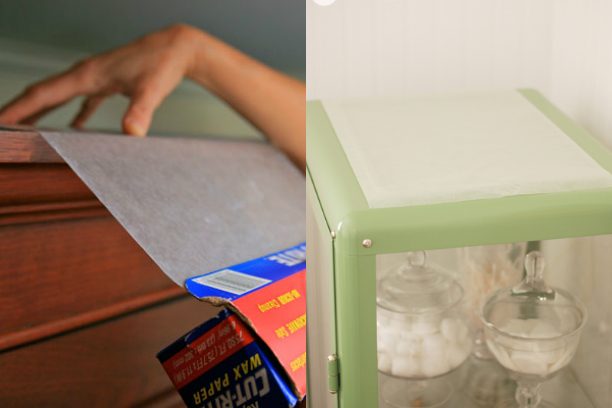 Пергаментом можно защитить поверхности кухонных шкафчиков и холодильника, которые со временем покрываются слоем жира и пыли. Так вам не придеться их оттирать и мыть, а достаточно будет лишь сменить защитный бумажный слой.