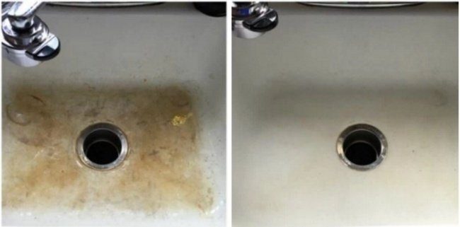 Смешайте 2 ст. л. кальцинированной и 2 ст. л. питьевой соды в однородную массу и натрите влажную ванну этой смесью. Через 10 минут смешайте 50 г уксуса и 50 г отбеливателя и нанесите поверх первого слоя. Через полчаса ополосните ванну большим количеством воды.
