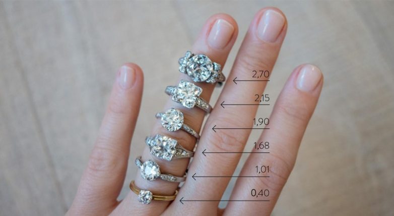 Изящность кольца напрямую зависит от каратности бриллианта в нём. Смотри картинку, как выглядят на руке камни разной массы.