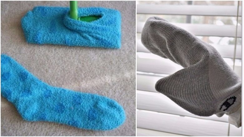 Надетым на руку носком можно также протирать зеркала, оконные стекла, картины, фоторамки, ночники, бра, люстры или фары автомобиля. Чтобы вымыть труднодоступные места, можно надеть носок на швабру.