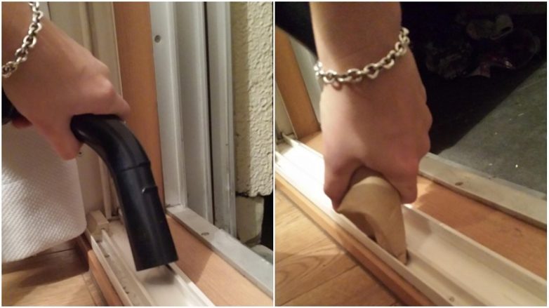 Иногда даже самая маленькая насадка пылесоса оказывается слишком большой для некоторых труднодоступных мест в квартире. Эта проблема легко решается с картонной втулкой от рулона туалетной бумаги. Надень втулку на трубку пылесоса, как это показано на фото, и сожми ее конец, чтобы он проходил в узкие щели.