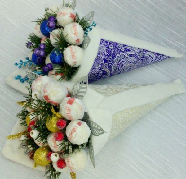 Еще одна интересная вариация букета из конфет к Новому году в интересно декорированном цветочном рожке.