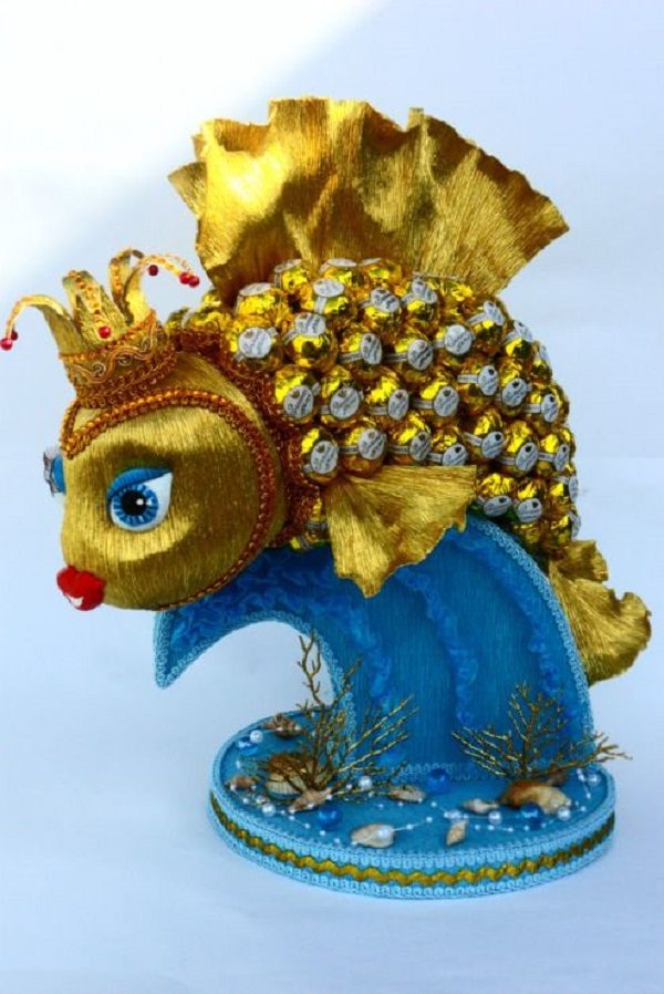 Ах, какая восхитительная золотая рыбка! Такой подарок не только вкусный, он еще и послужит неким символом исполнения желаний в новом, 2018 году и для дарящего, и для виновника торжества.