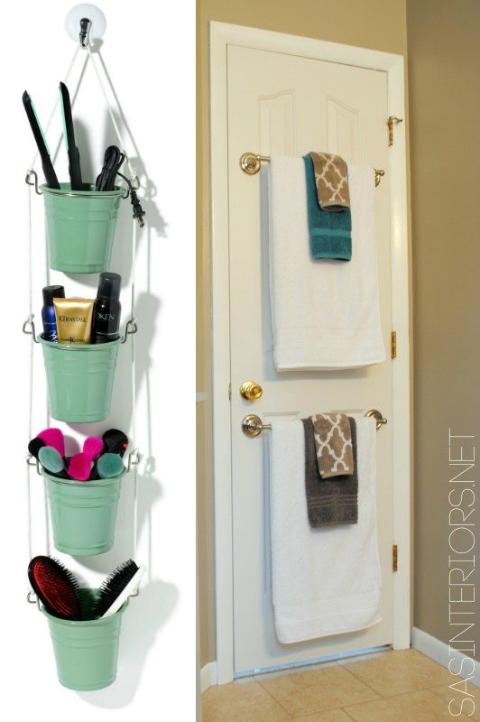 И вновь используемкрючки и рейлинги. Фото слева: с помощью одного крючка на стене можно соорудить целый подвесной стеллаж. Используем несколько ведер из ИКЕА, скрепленных между собой бельевой веревкой. Отличное местечко для кисточек для макияжа, расчесок, щипцов или бигуди.Фото справа: нет места для полотенец? Крепите их к двери в ванную. Причем, использовать можно не только верхнюю часть дверного полотна, но и нижнюю!